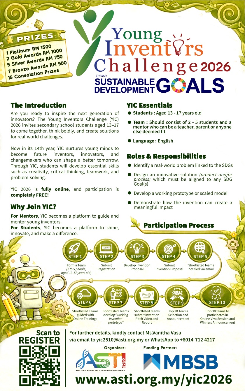 The Young Inventors Challenge 2026 aims to encourage secondary school students aged 13 – 17 to cooperate as a team (2-5 students) to find innovative solutions to current day problems. YIC is an educational project focusing on the participants learning.